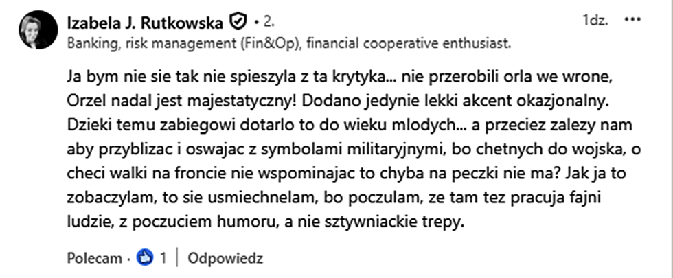 Warto pamiętać, że poszerzanie zasięgów jest wyższą szkołą PR-owej jazdy. Wymaga doświadczenia. Szczególnie, że dla sporej grupy użytkowników Social Mediów wojsko nie jest instytucją zaufania publicznego, ale organizacją opresyjną i nadmiernie kosztowną. Czy pojedyncza grafika z okazji jakiegoś wydarzenia – zamiast profesjonalnej kampanii informacyjnej – mogła zmienić takie nastawienie do wojska? Nie.